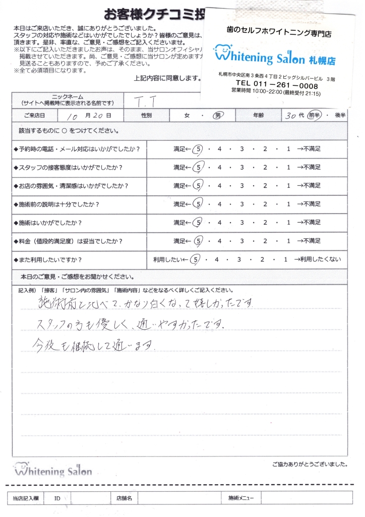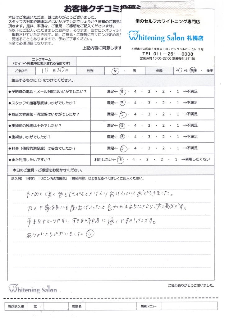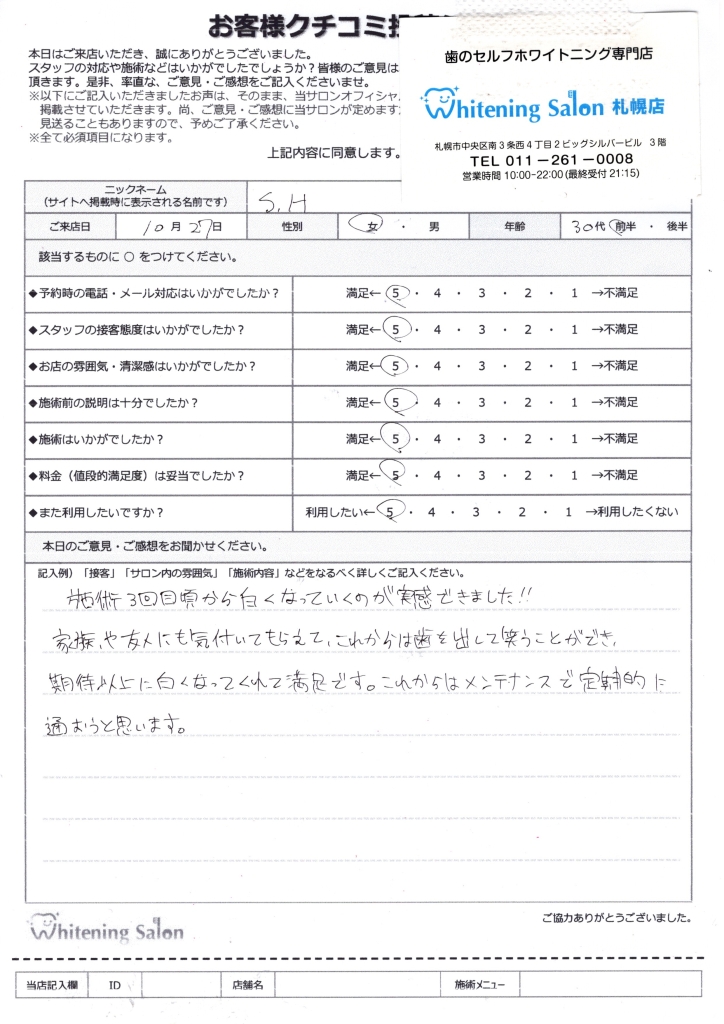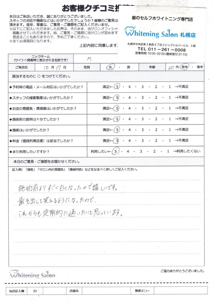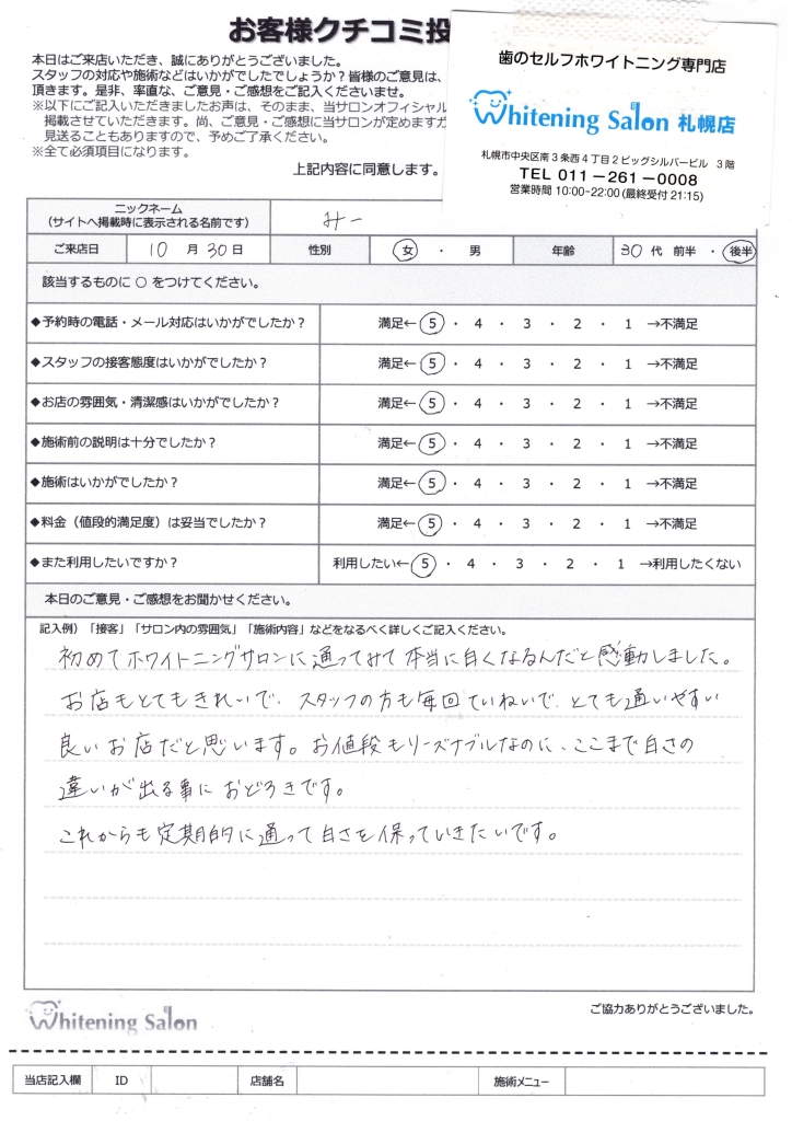 歯の色が気になり,SNSでこちらのサロンを見つけ、通わせていただきました。