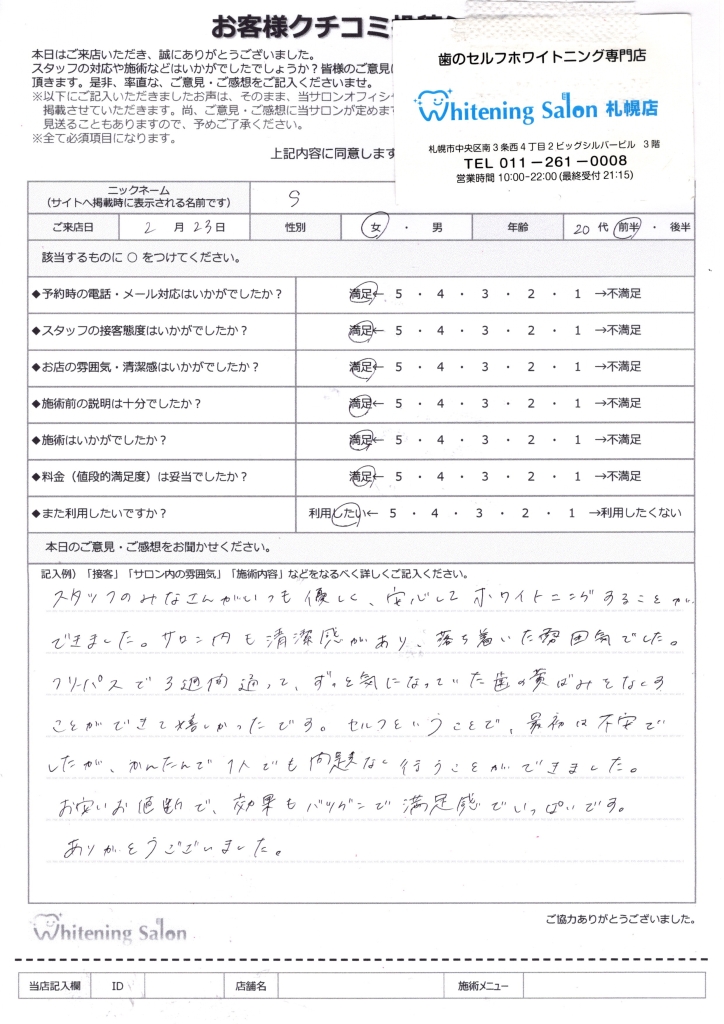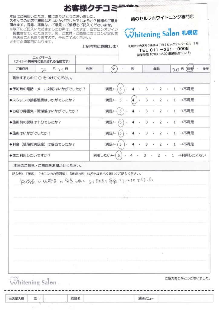 スタッフのみなさんがいつも優しく、安心してホワイトニングすることができました。