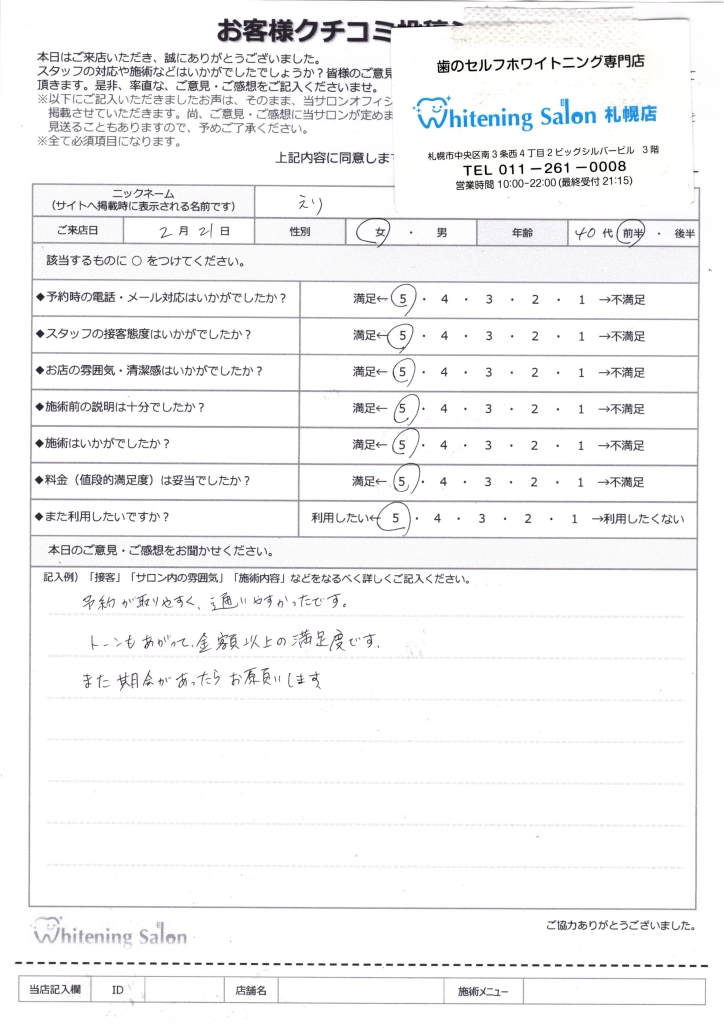 とても満足できました。白さを保てるようにこれからも続けていこうと思います。